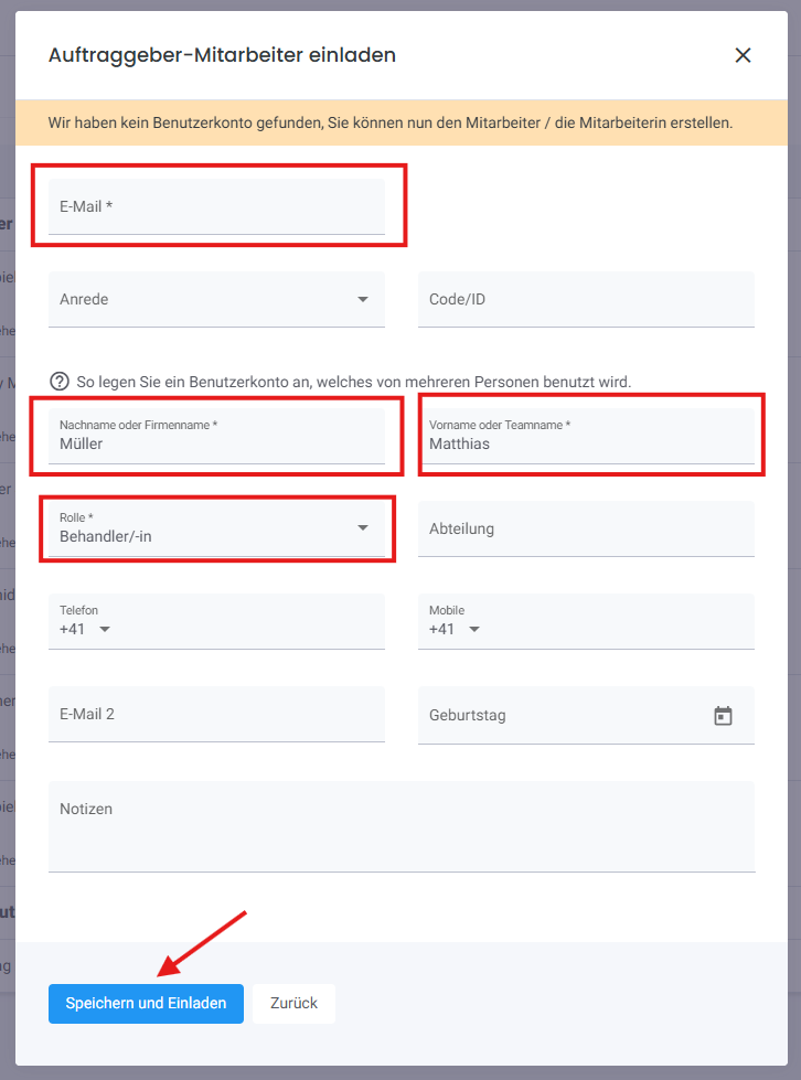 Falls die gesuchte Person noch kein Condent-Account (Benutzerkonto) hat, wird ein Popup angezeigt, bei welchem Sie nun die relevanten Felder ausfüllen können wie:
