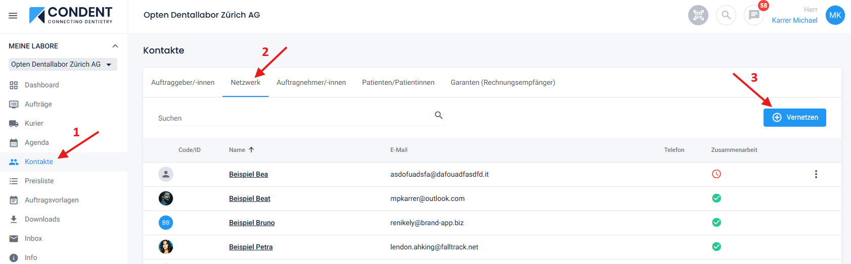 - Links in der Navigation unter "MEIN LABOR", klicken Sie auf Kontakte (1).