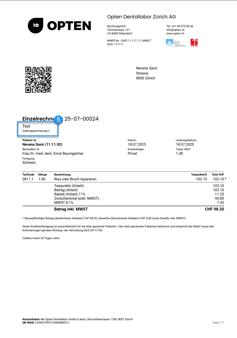 - Die generierte Rechnung erhält den Vermerk „Zahlungserinnerung“.