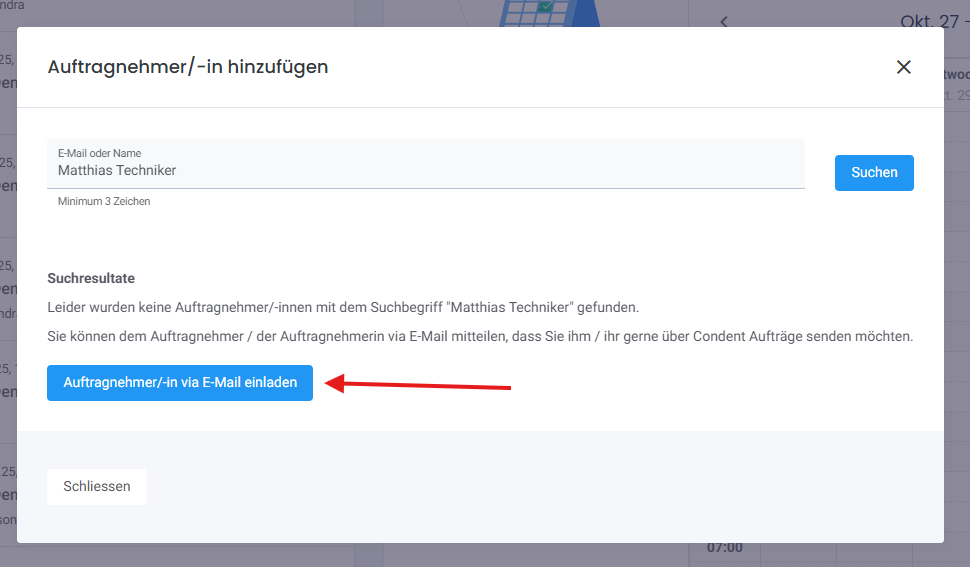 Es erscheint ein Popup und Sie können auf den Button "Auftragnehmer via E-Mail einladen". Nun erscheint eine vorgeschriebene E-Mail um Ihren Auftragnehmer einzuladen.