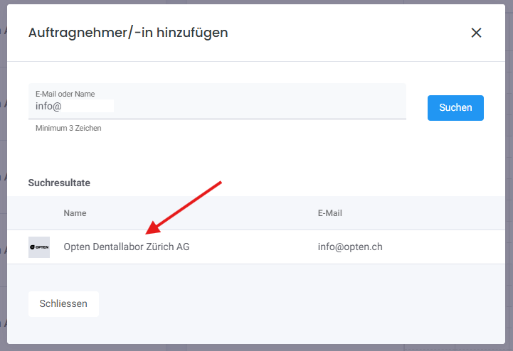 4b Falls Ihr Auftragnehmer bereits ein Condent-Benutzerkonto hat, erscheint ein Popup und Sie sehen unter den Suchresultaten sein Labor. Klicken Sie auf den Namen des Labors und anschliessend auf den blauen Button "Zusammenarbeit anfragen".