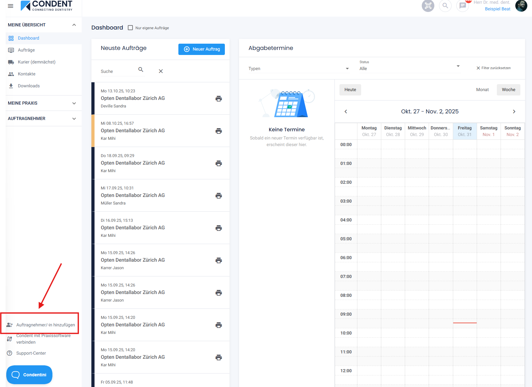 Sie sind der Auftraggeber (Zahnarztpraxis) und besitzen bereits ein Condent-Benutzerkonto. Nun möchten Sie Ihrem Auftragnehmer (Dentallabor) die Aufträge über Condent übermitteln.