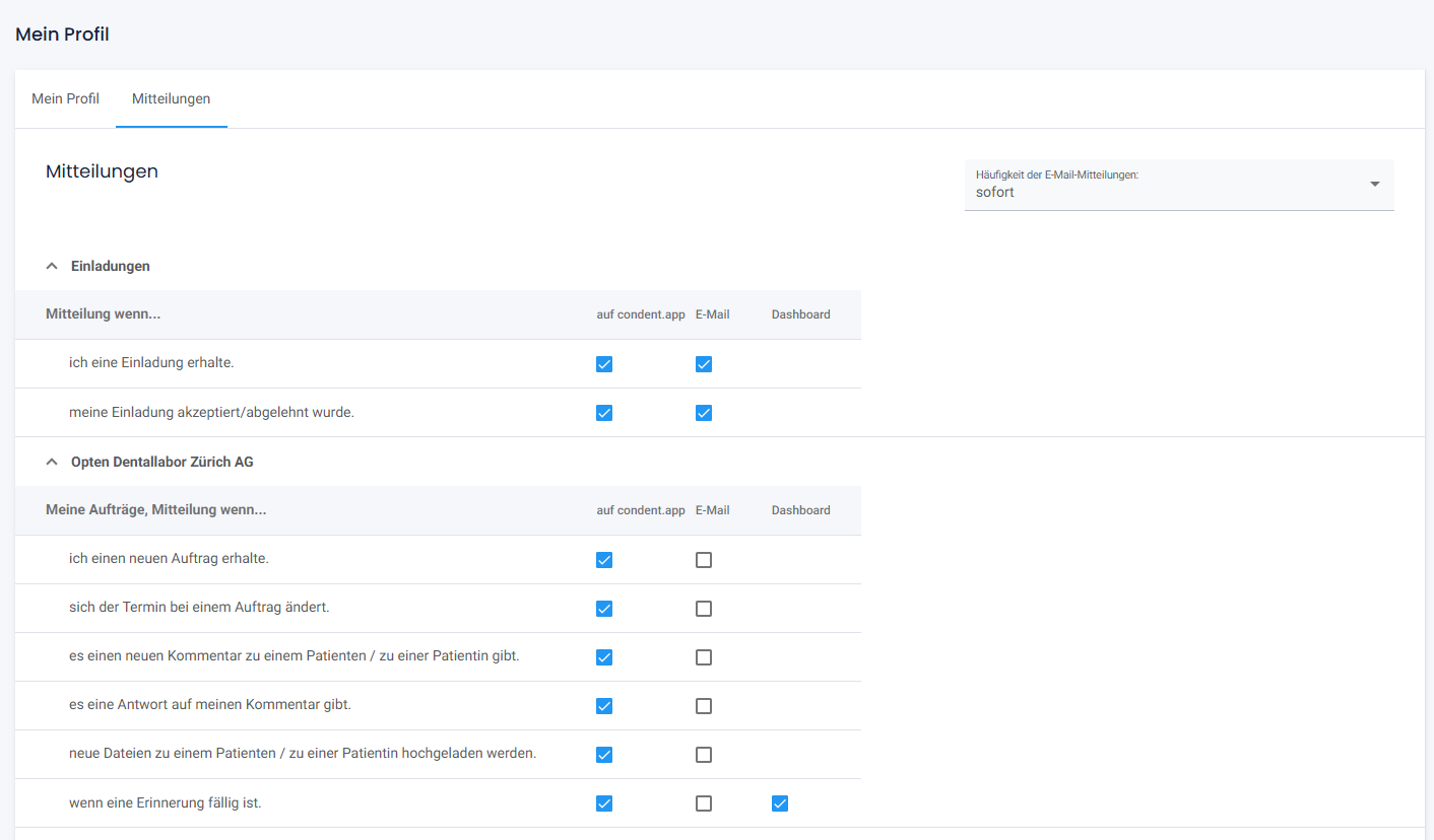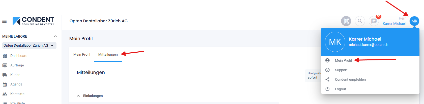 Klicken Sie oben rechts auf "Ihr Profil" > "Mein Profil" > Tab "Mitteilung"