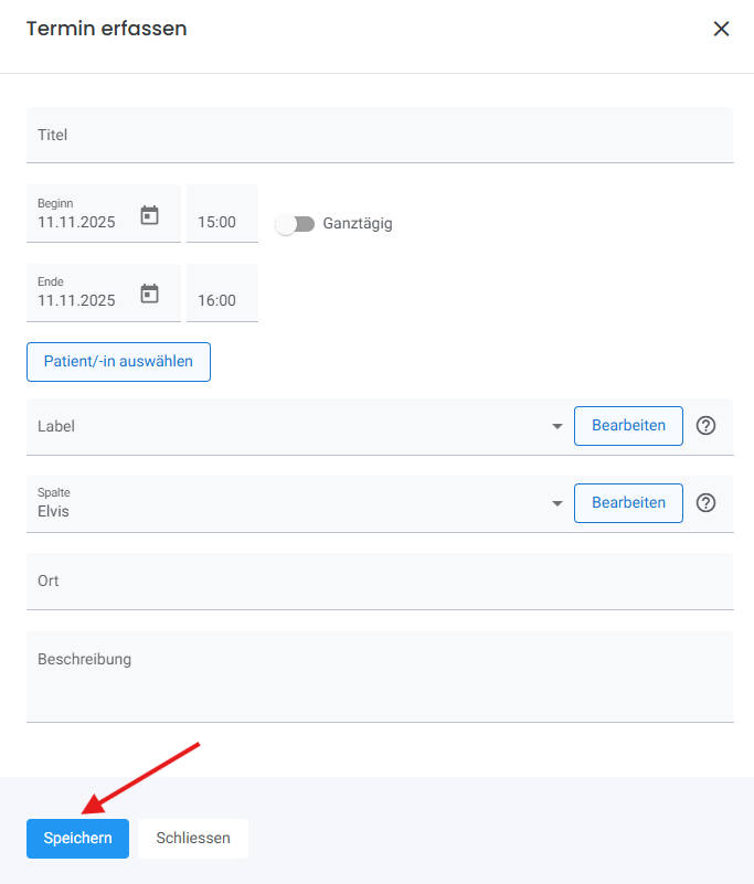 Dazu gehen Sie in die "Agenda" und klicken oben rechts auf den blauen Button "Neuer Termin":