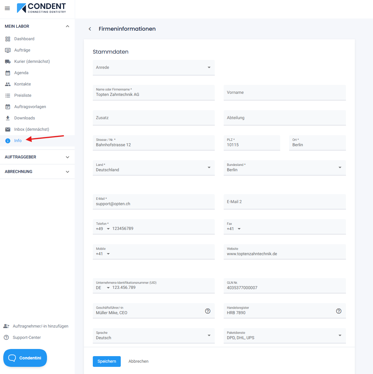 Erfassen Sie die Stammdaten Ihres Dentallabors wie folgt: gehen Sie unter "Mein Labor" ➔ "Info" ➔ "Firmeninformation" und klicken auf das Bleistift klicken.